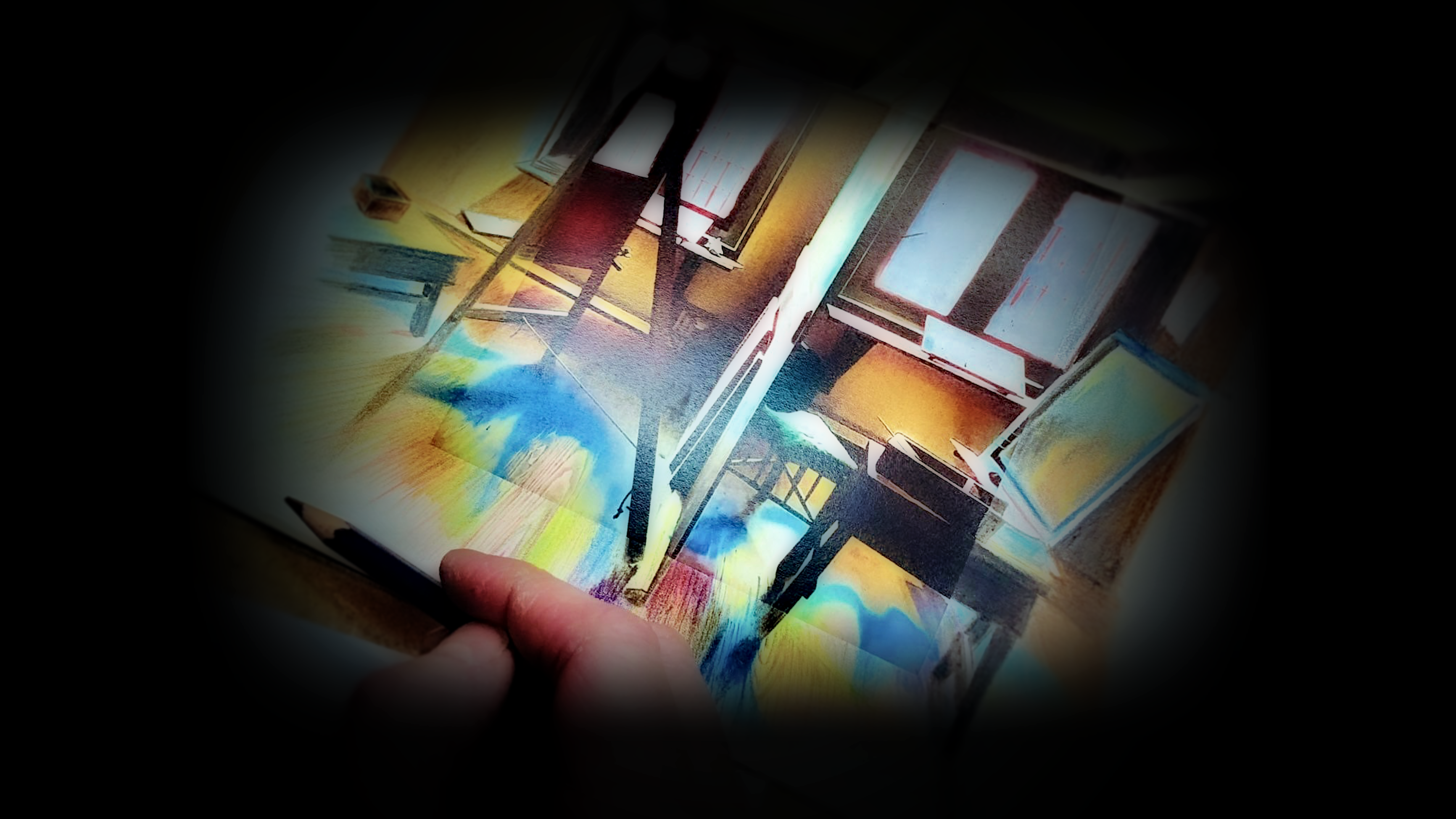 He takes a moment to focus on mixed media drawings, combining graphite pencils with a touch of color, often using blue, to add an extra dimension to his works.