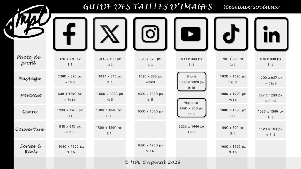 | Réseaux sociaux (dimensions au choix) 1 visuel de couverture 1 portrait 1 carré 1 paysage 1 photo de profil 1 GIF |
